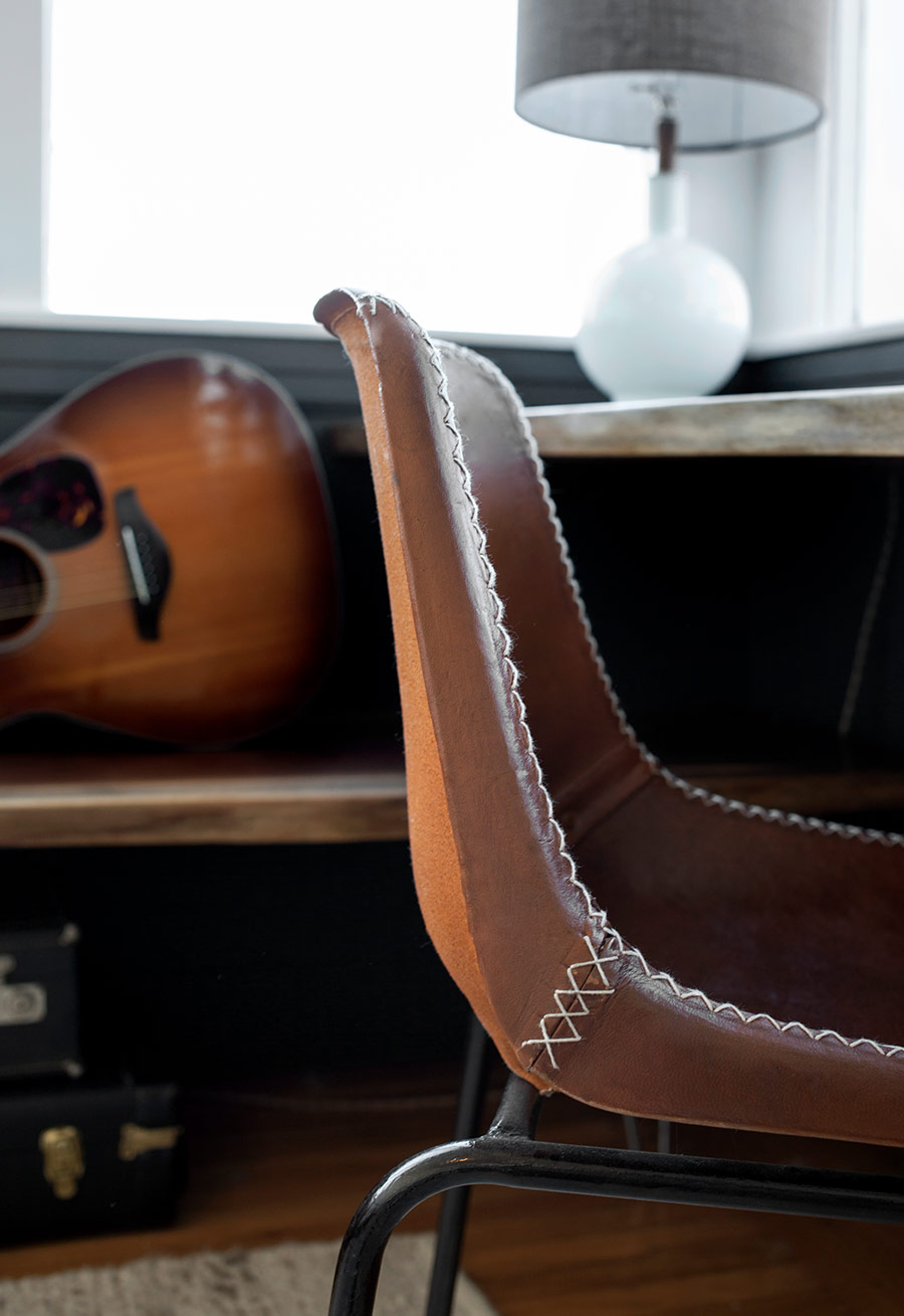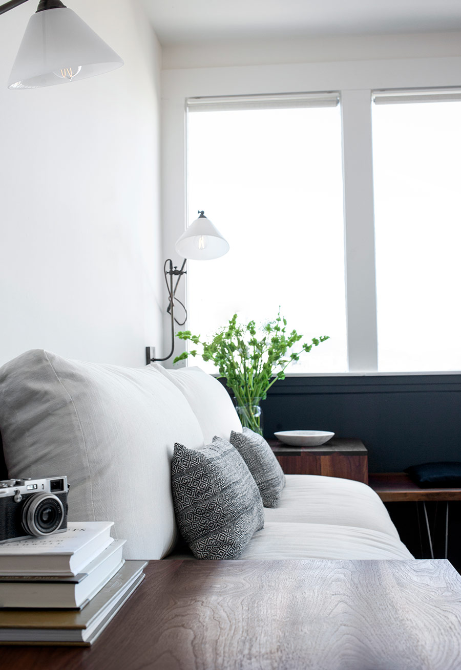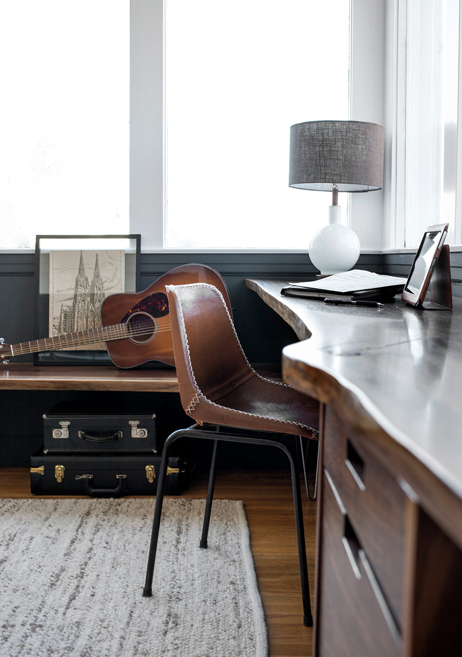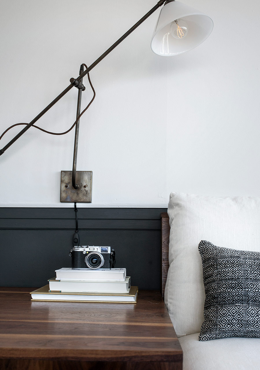The Details MatterDark painted wianscot treatment anchors the room, creating light and dark contrast, while the cozy rug, creamy upholstery and warm wood tones create a welcoming living room lounge. |