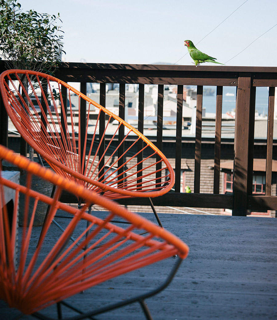 Mixed Use SpacesThe ample outdoor deck allows for a work and dining space, a large lounge space and a more intimate, but bright conversation area. Mixed use of woods and metals, highlighted by a pop of color creates a fun and relaxing outdoor space that maximizes function and the iconic views. |