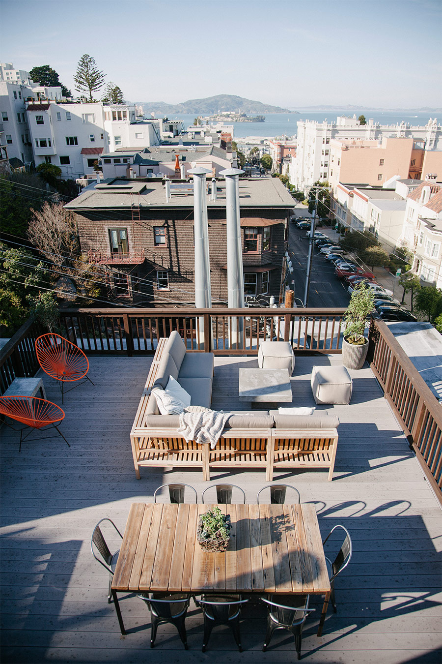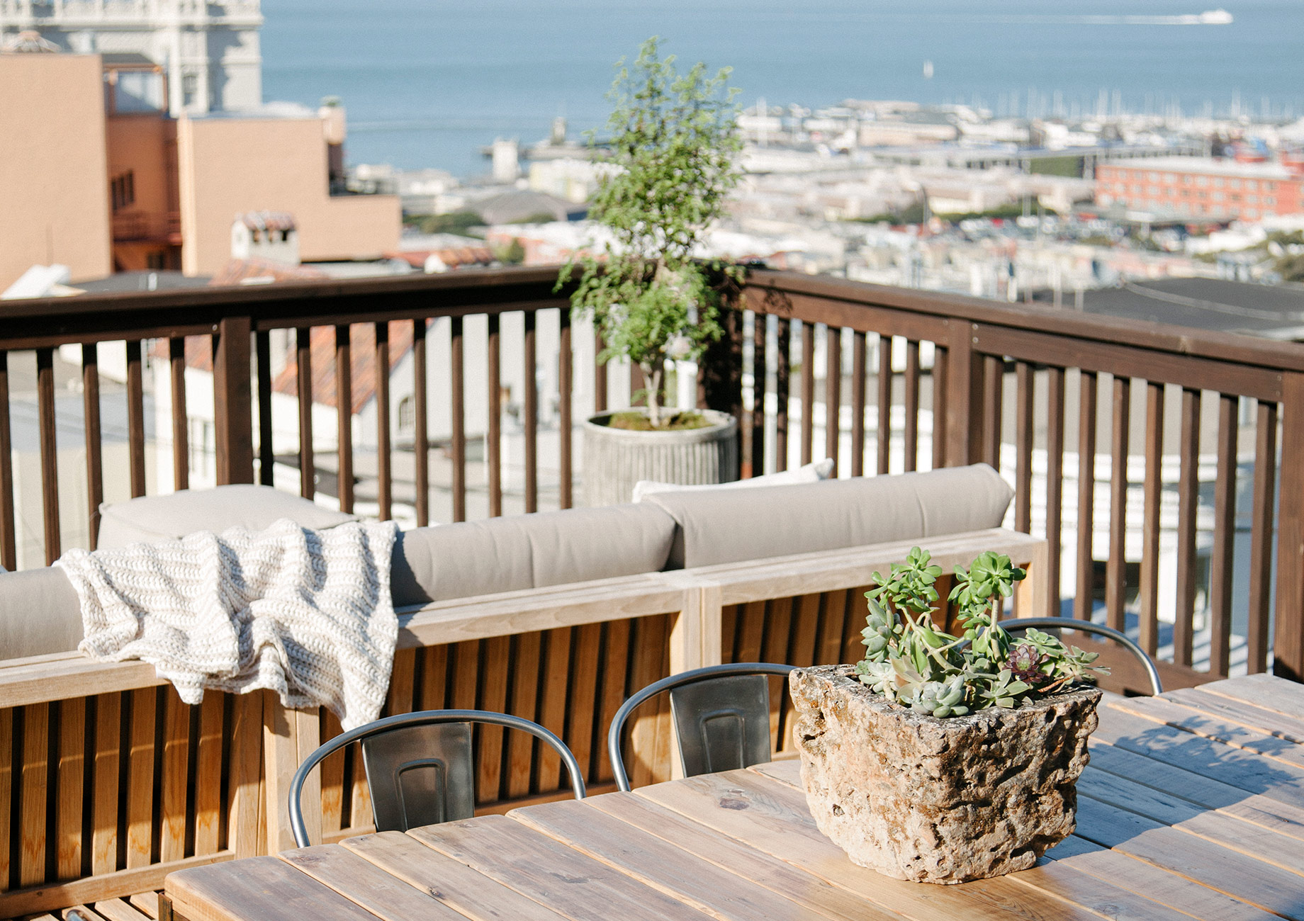 A living room and outdoor deck, situated on the top of Russian Hill, with iconic views of the San Francisco Bay, Alcatraz Island and sparkling Sausalito.