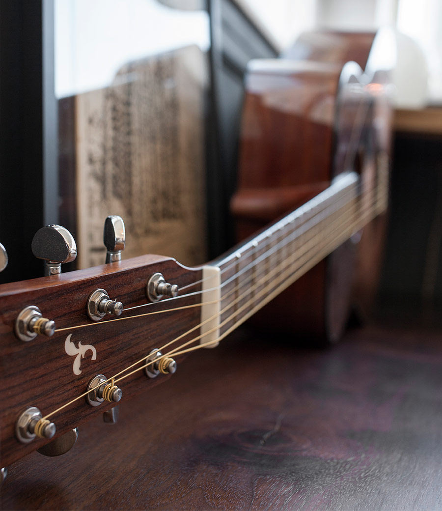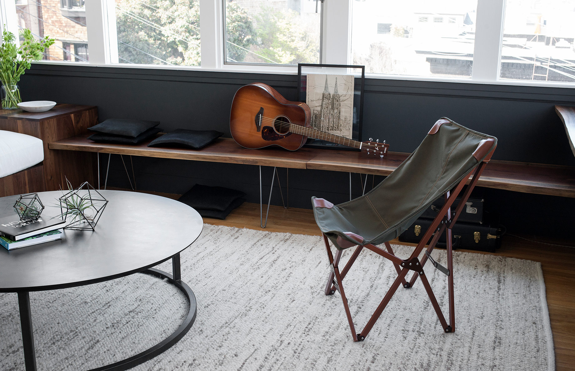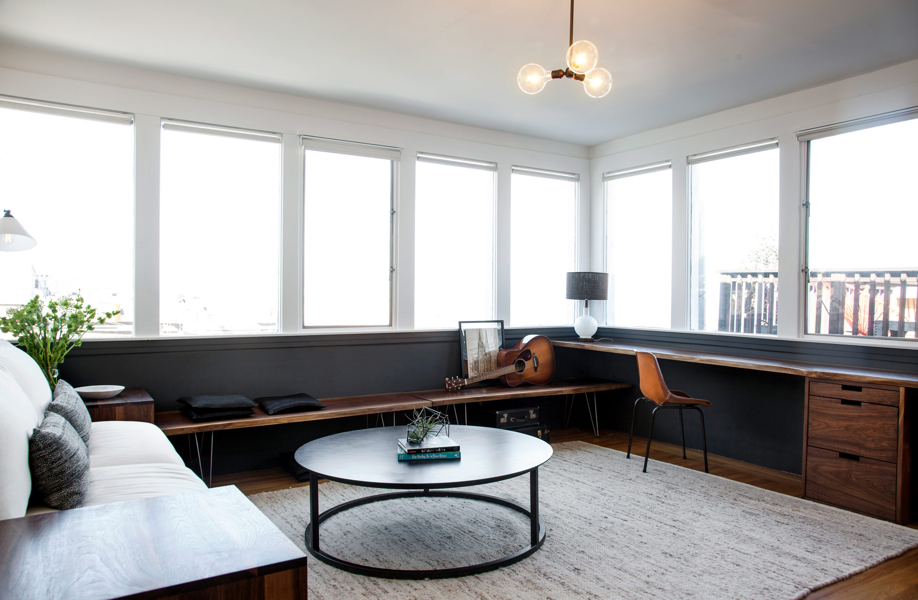 Design features a rich wood tone, U-shaped built in sofa, bench, and liveedge desk wrapping the perimeter of the space, providing function yet maximizing the view out the simply dressed windows.