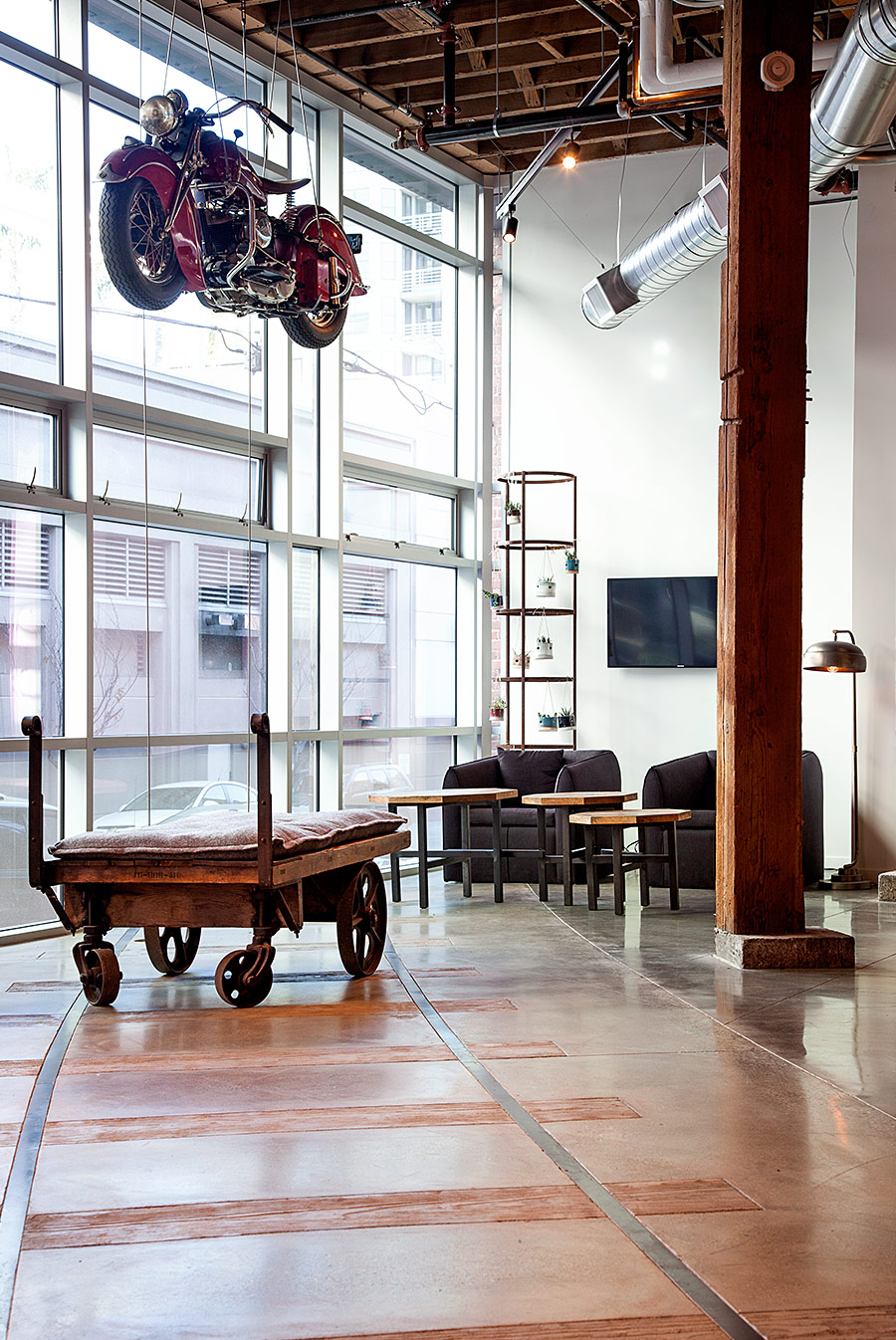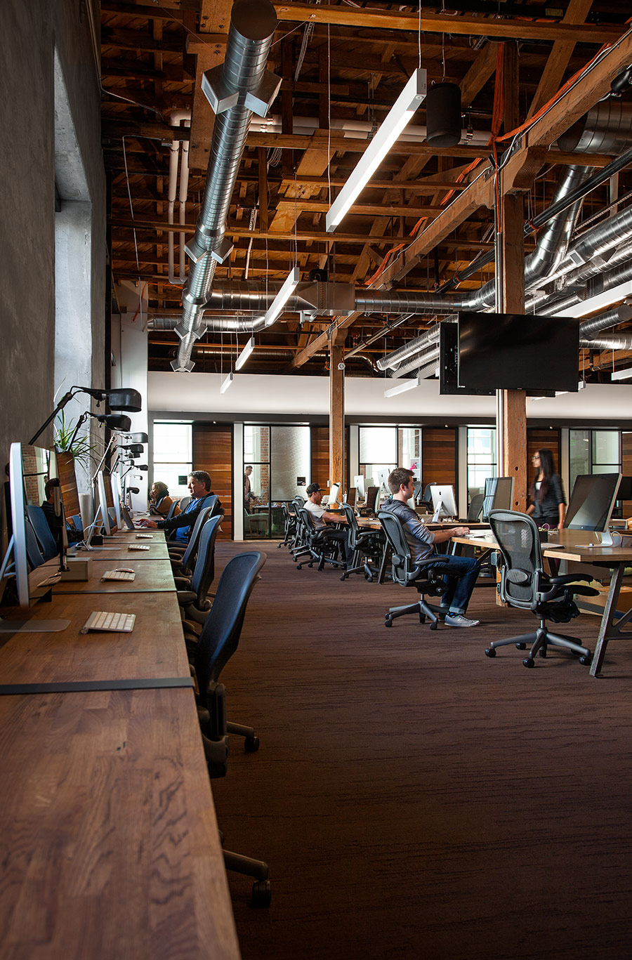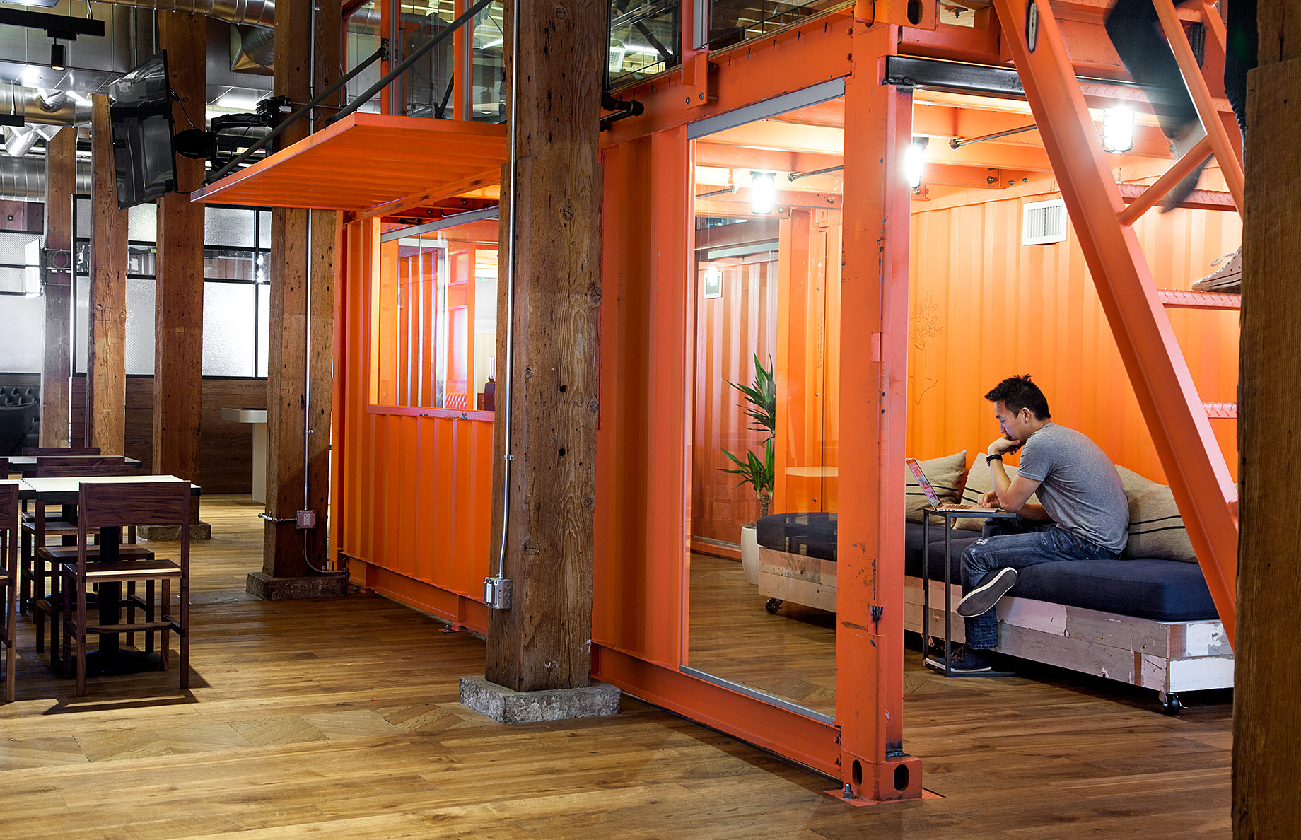 The beautiful brick and timber space was once the site of a dried fruit packing warehouse in the early 1900’s. Along with GitHub’s own “ship it” mentality, the design honors the rich roots of the space through the use of vintage shipping containers, deconstructed and rebuilt on site as a reference to the train that rolled right through the ground floor.
