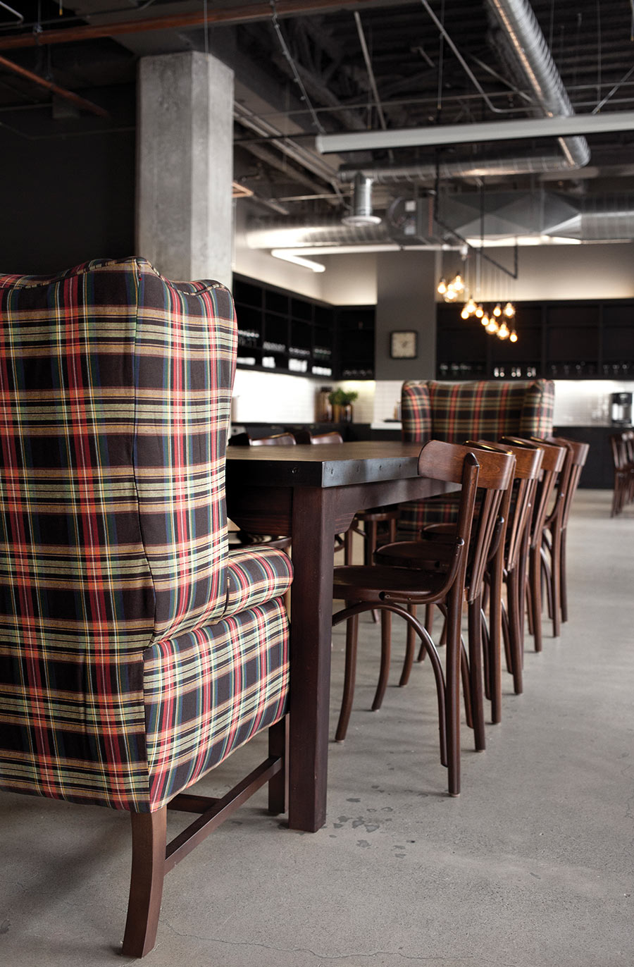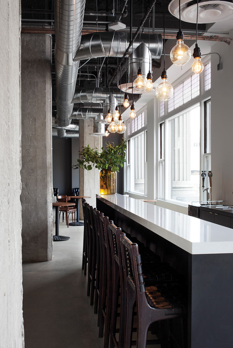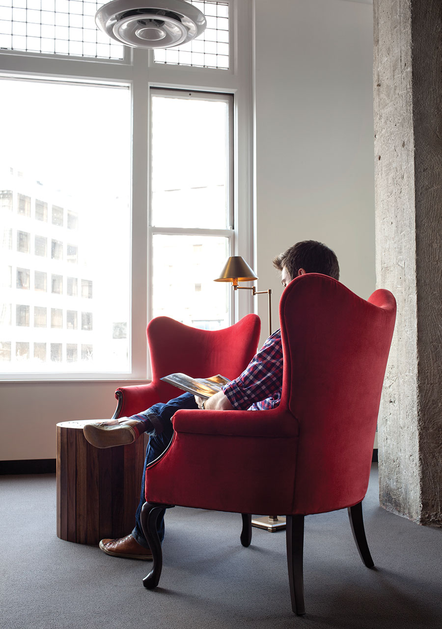 The Details MatterA highly customized FF&E package invites employees and guests to enjoy the work space as they would a hip hotel lobby, with tasteful lounge seating, an elegant cafe, and a strategically situated bar boasting views of a vibrant Market Street below. |