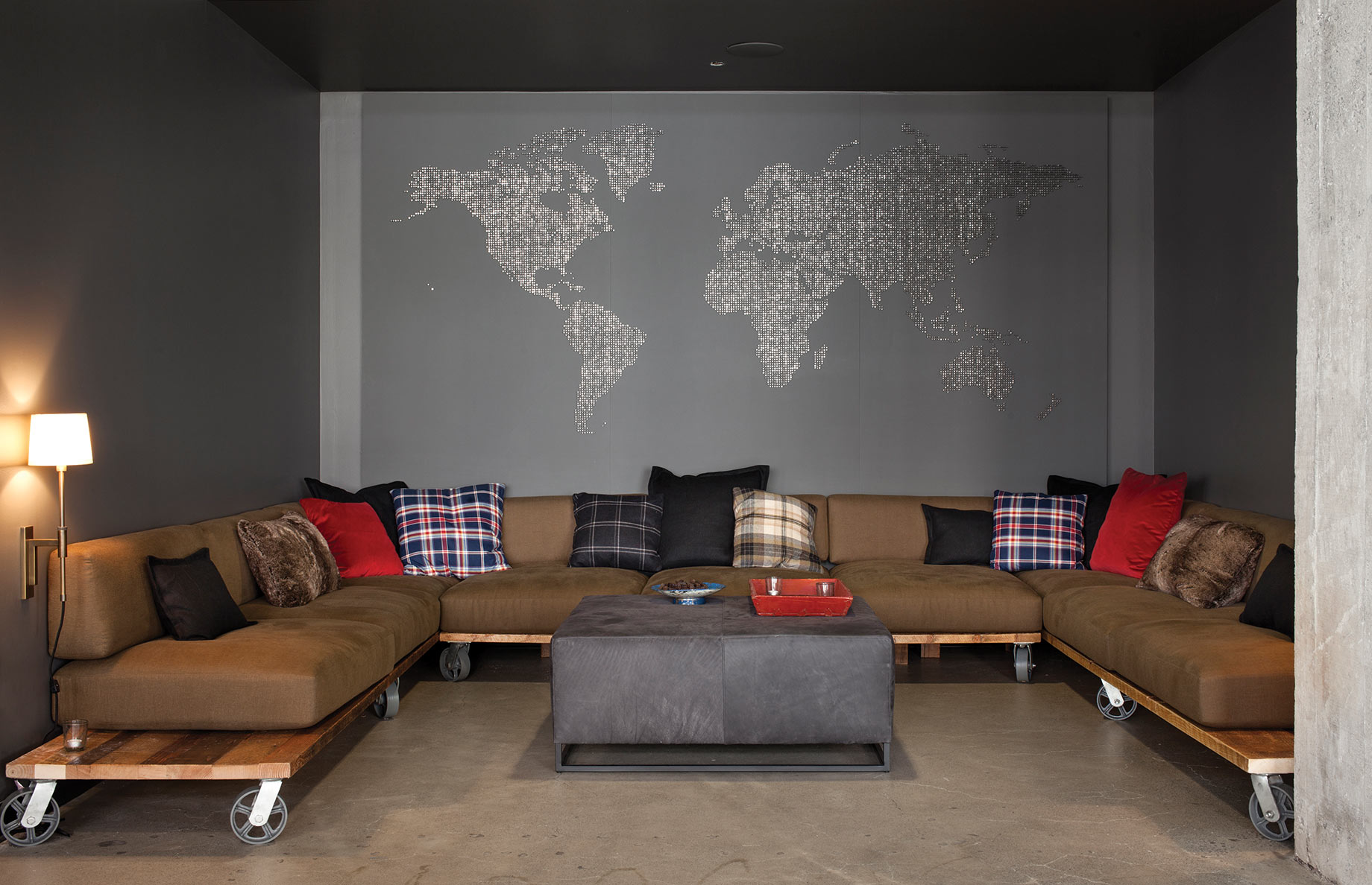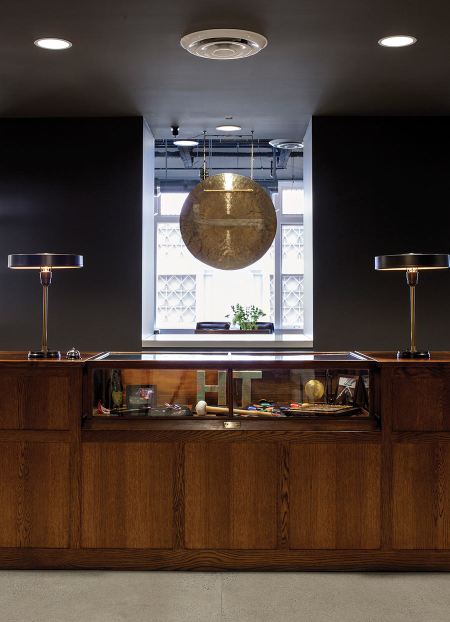 Custom details including a beautiful hotel-inspired reception desk with an integrated vintage display case housing significant Hotel Tonight moments and a custom light fixture in the style of their beloved “H-Bed” logo reinforce the company’s unique identity as both a tech and hospitality-centered operation.