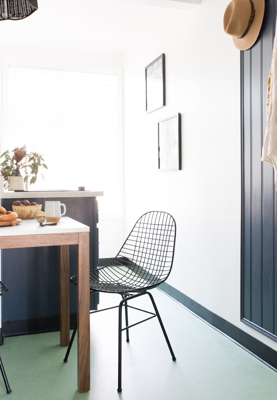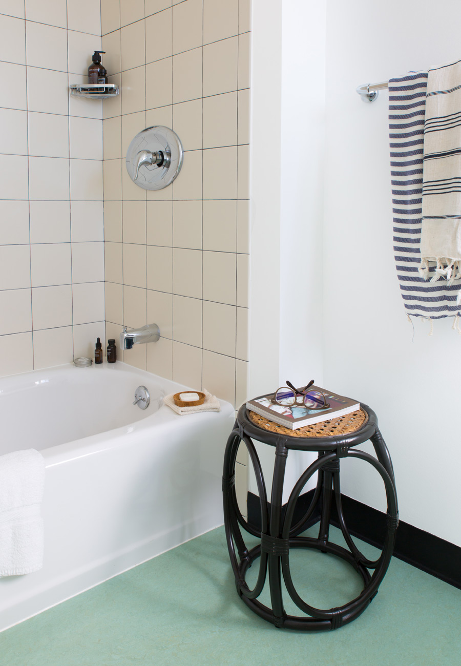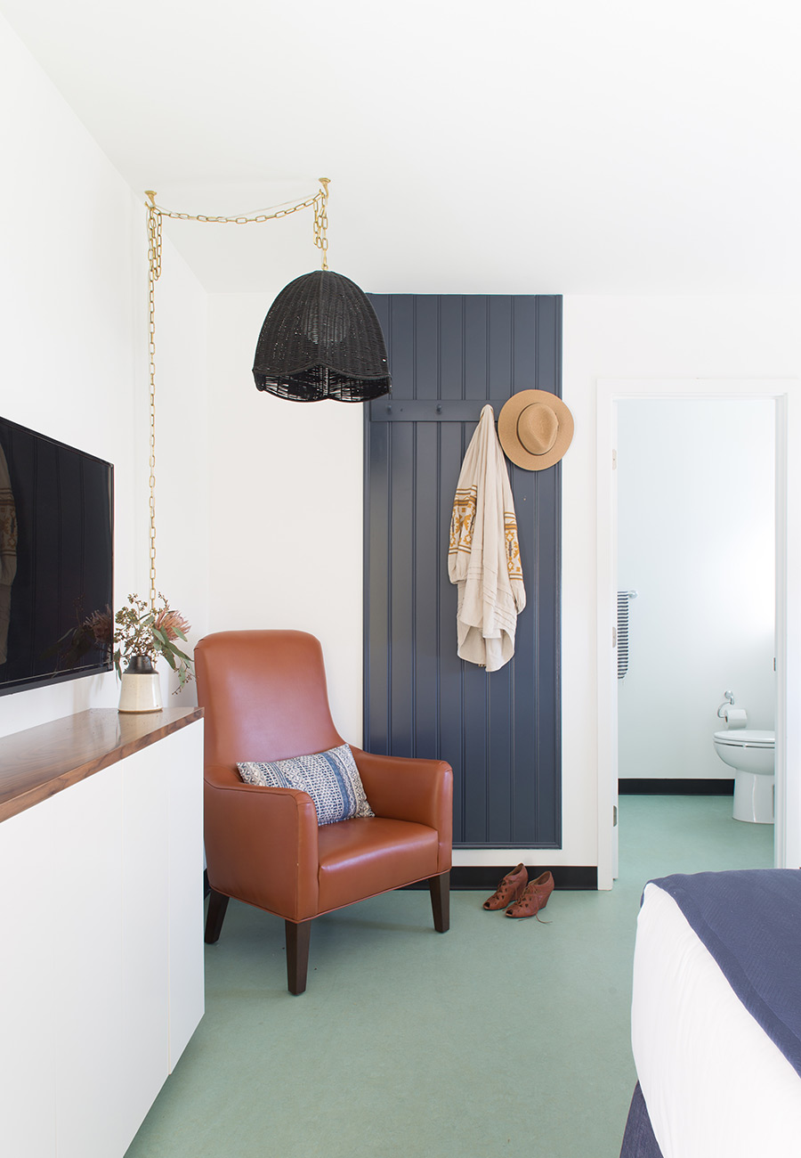 We chose an energetic teal Marmoleum flooring that was an exact match to original linoleum uncovered during the demolition of part of the hotel. 6x6 cream square tiles in the bathrooms, walnut accented casegoods, and painted wood paneled “wall closets” add warmth and texture.
