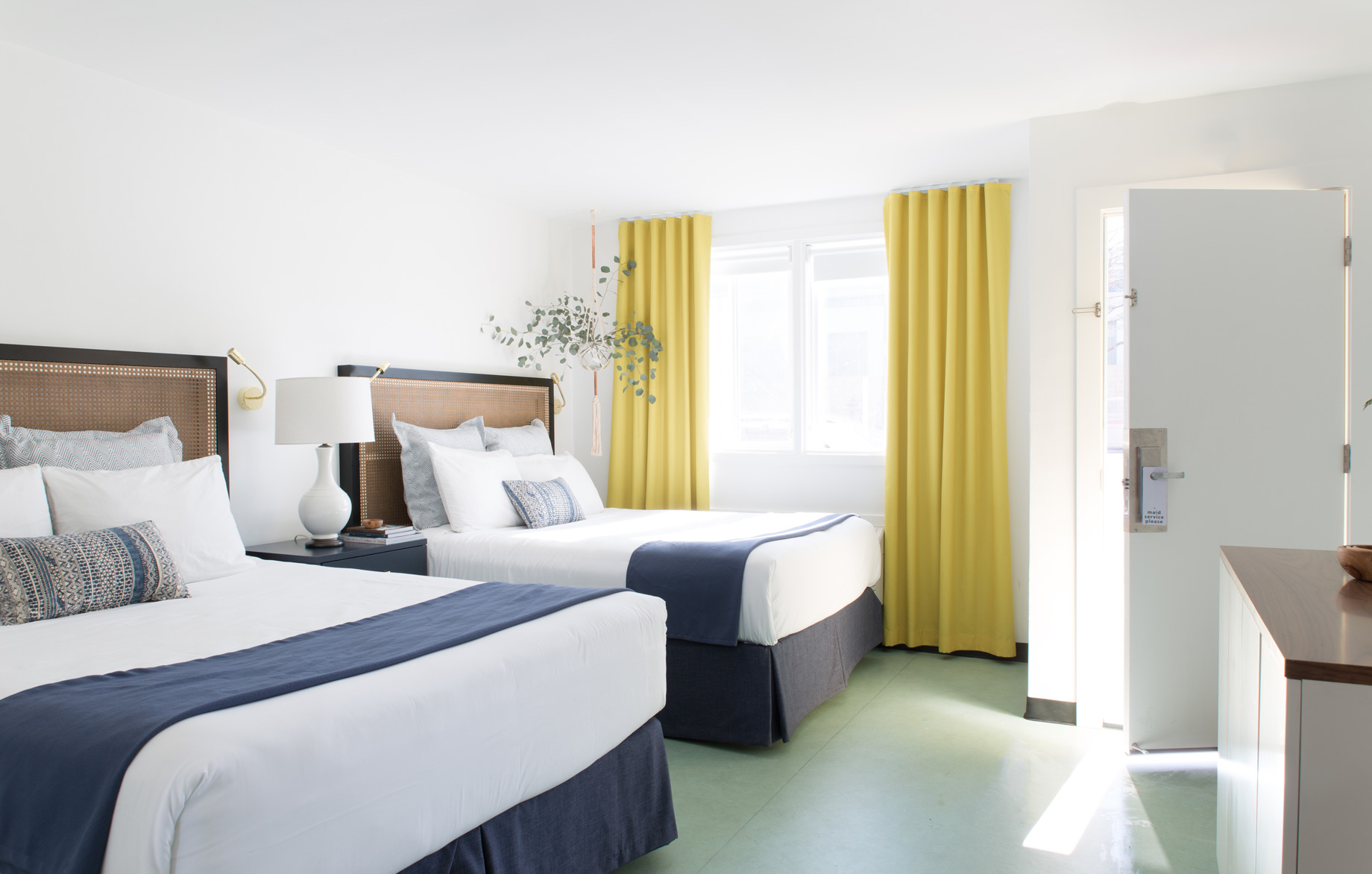 With a fun 1960’s retro façade and large sun-filled guest rooms and bathrooms, our design approach was clear! We peeled away layers of unnecessary finishes and superfluous design to unveil simple, fresh, clean, and modern rooms. Accented by a stylish and refined palette of crisp white, midnight blue, and sunny yellow, the rooms are simultaneously sophisticated and comfortable.